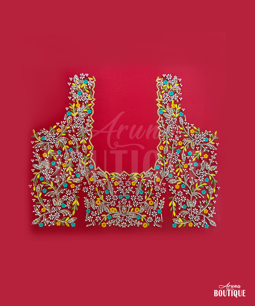 At Aruna Boutique, we create designer bridal blouses with high quality maggam work and strong stitching. This bridal maggam work blouse features beautiful bead work using 1.7 mm, 2 mm, and 3 mm beads. These beads add shine and luxury to the blouse design, making it perfect for bridal wear.